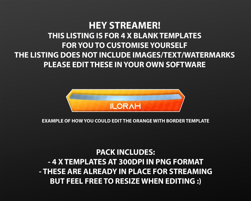 1 zip file with 4 x health bar templates (1 x no border orange, 1 x white border orange, 1 x no border purple & 1 x white border purple) as shown in the listing. These do NOT include logos/text/images.