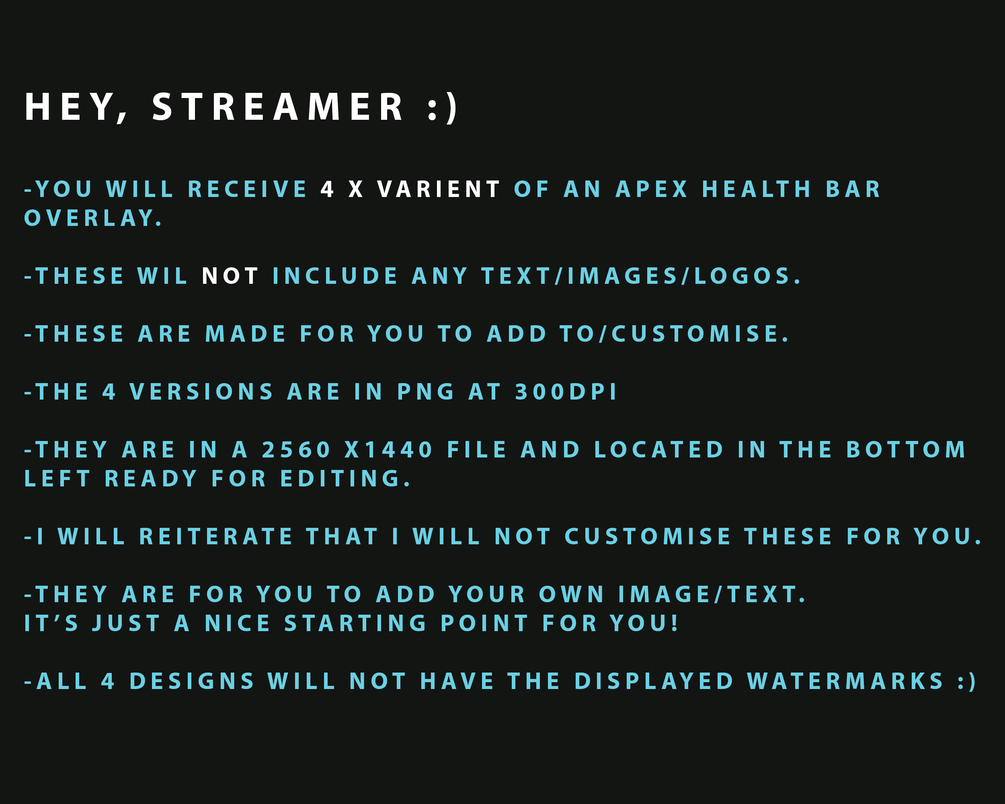 These are in PNG format at 300DPI on a transparent 2560 x1440px image with the health bars in the bottom left corner ready for you to customise and resize.